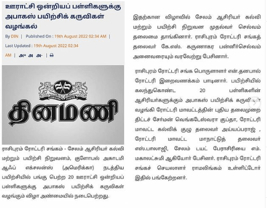 As a part of the Rural Empowerment Programme, ABACUS kits were distributed to the teachers of DIET ( District Institute of Education and Training), Salem to start training the students in 20 Government/Panchayat schools.